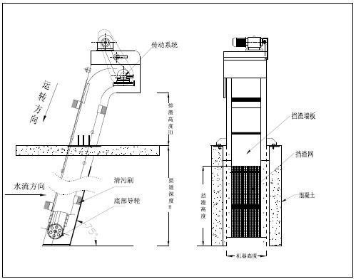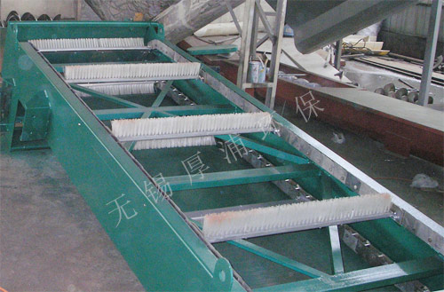 WBF轉刷網蓖式格柵除污機主要由驅動裝置、機架、主軸、柵網、托渣板、固定板刷、回轉刷及牽引鏈組成。在電機驅動下,通過減速機減速后,帶動鏈輪與鏈條運動,固定在回轉鏈條上板刷沿柵網網面由下而上移動,清掃網面并帶走污物,污物運送至頂部時,大部分靠重力自行落至排渣都,少量附著在固定板刷上的污物被轉動的回轉刷清除掉,完成除污過程,液體則通過柵網的間隙流過,整個工作過程連續進行。